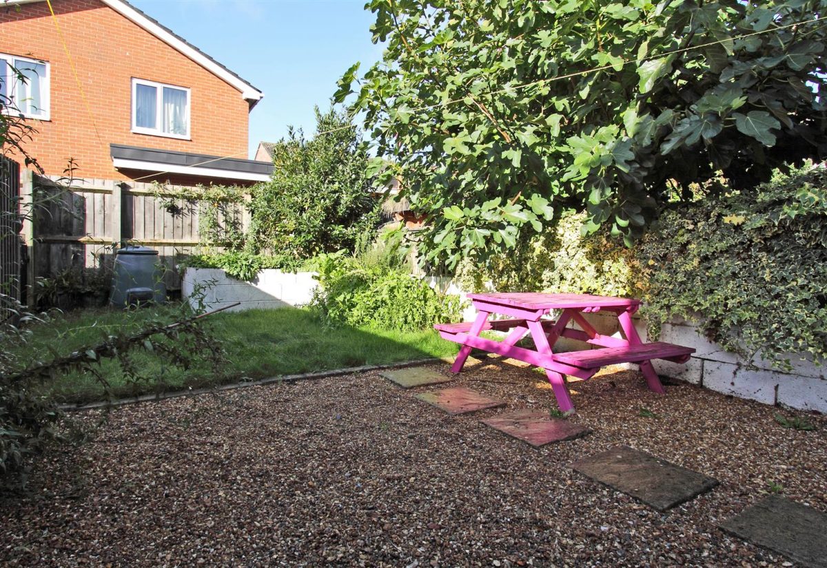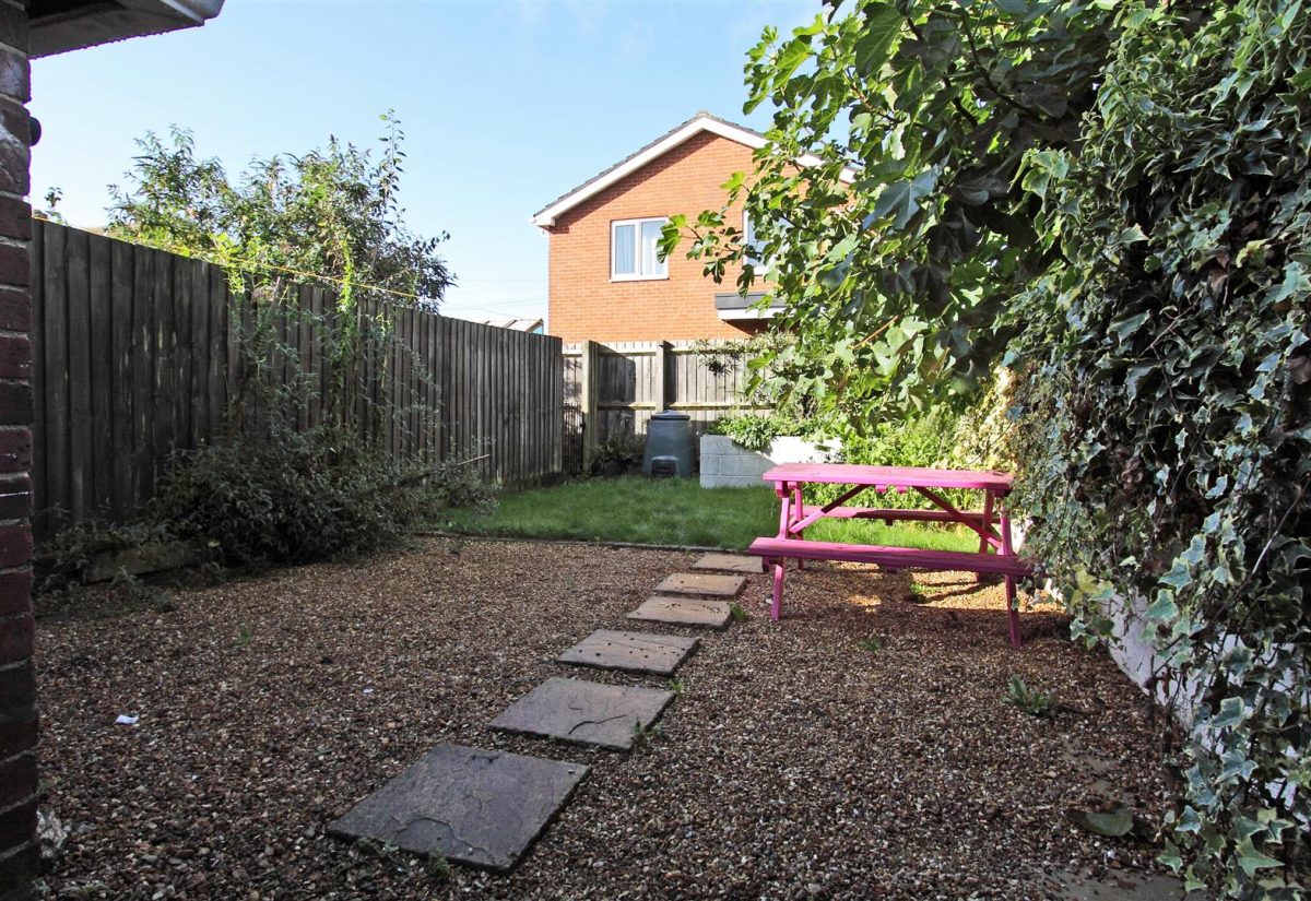 A wrought iron pedestrian gate opens to steps leading up to the covered front door, which is an attractive Regency-style composite door. To the rear, the garden features a generous area of lawn, a brick-built external shed and a slightly raised planting bed in the right-hand corner. The property also benefits from rear access via a single gate.