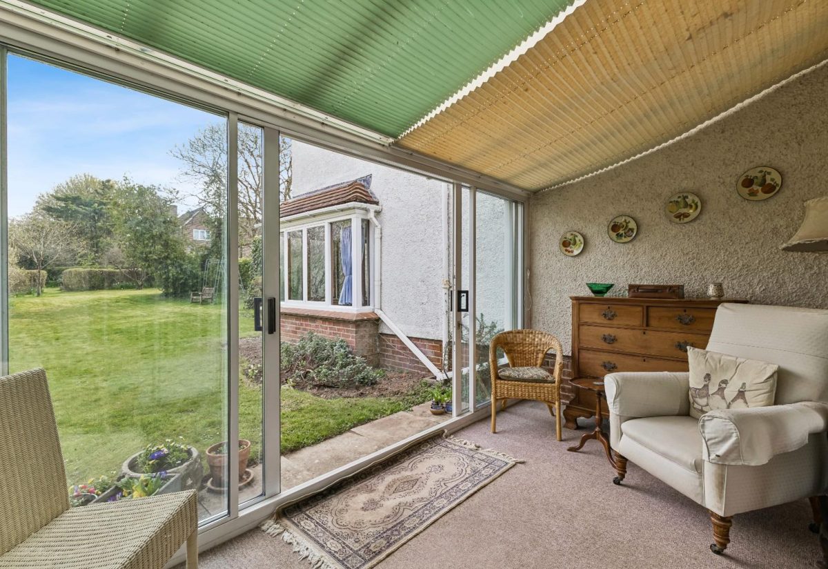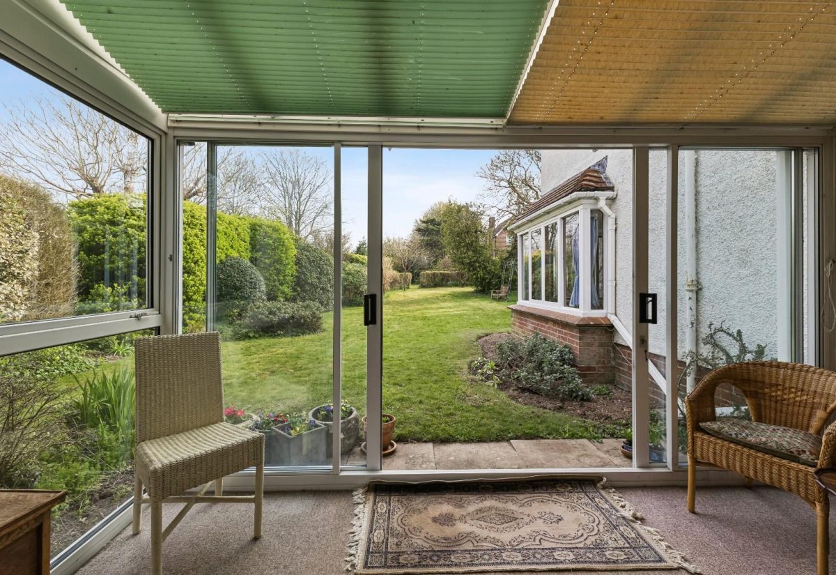 The sunroom has sliding patio doors opening onto the rear garden. It enjoys a particularly pleasant outlook down the length of the garden.