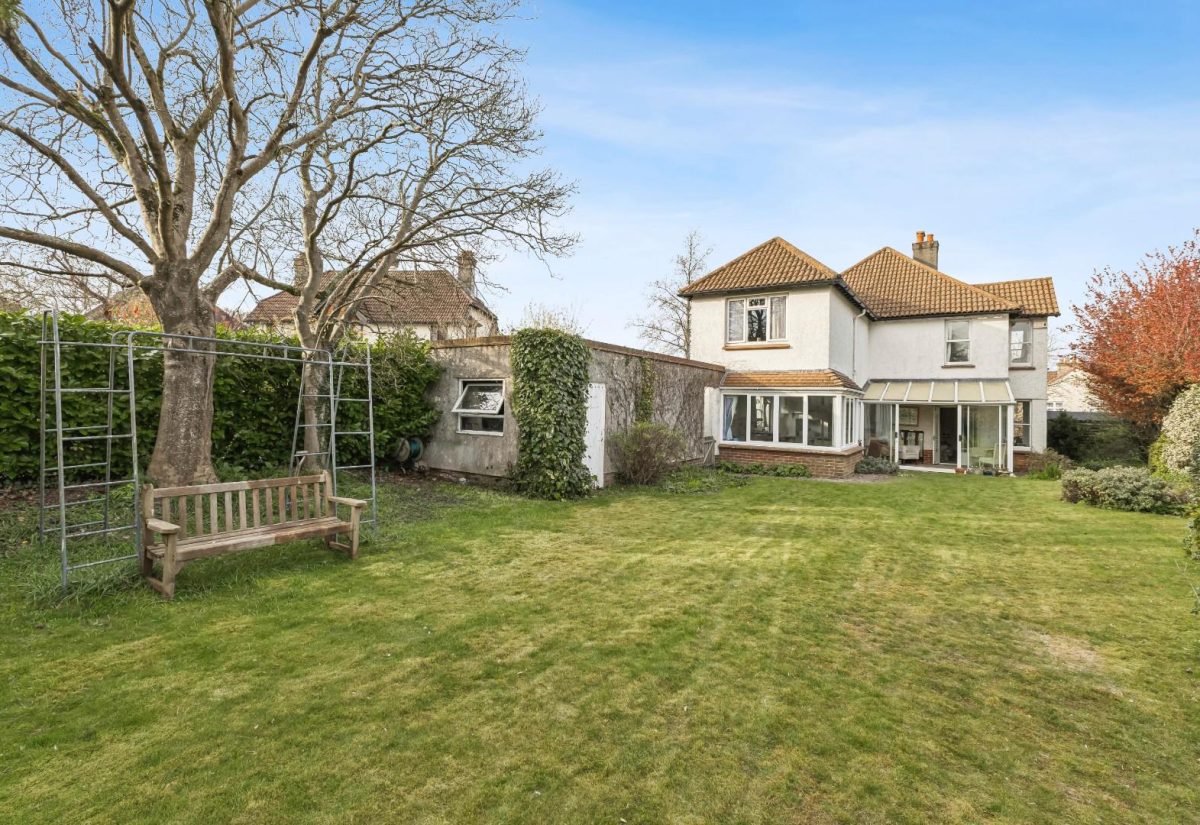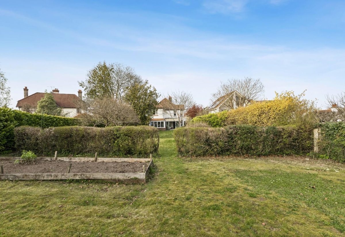 The attractive and extensive rear garden is predominantly enclosed by mature hedging along the boundaries, providing a high degree of privacy. It is mainly laid to lawn, interspersed with well-stocked flower and shrub borders, along with a number of specimen trees. The rear section of the garden is thoughtfully separated by a hedge, creating an ideal area for growing vegetables. This section includes a raised planting bed and a useful utility area. Approximately halfway along the garden there is an original air raid shelter.