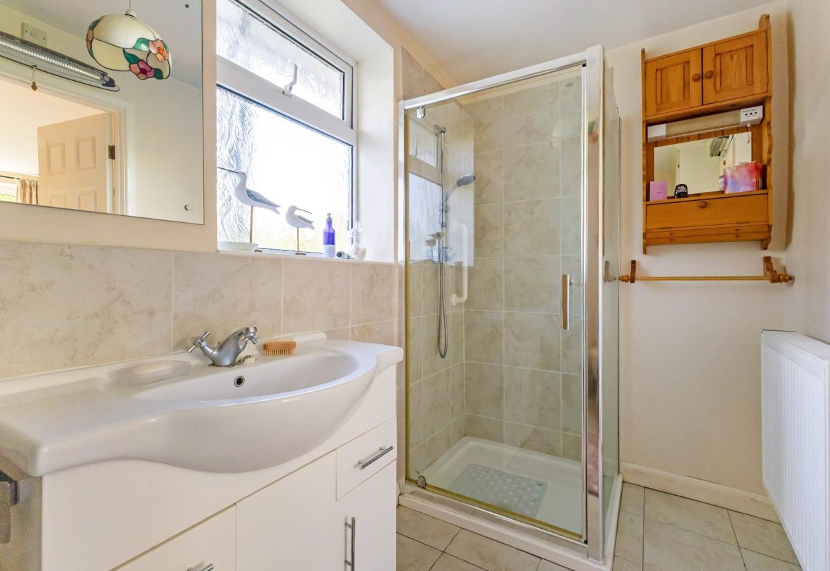 The bedroom benefits from its own en-suite shower room, comprising a tiled shower cubicle, a wash hand basin with vanity storage below, and a WC-offering a private and convenient facility within this spacious bedroom suite.