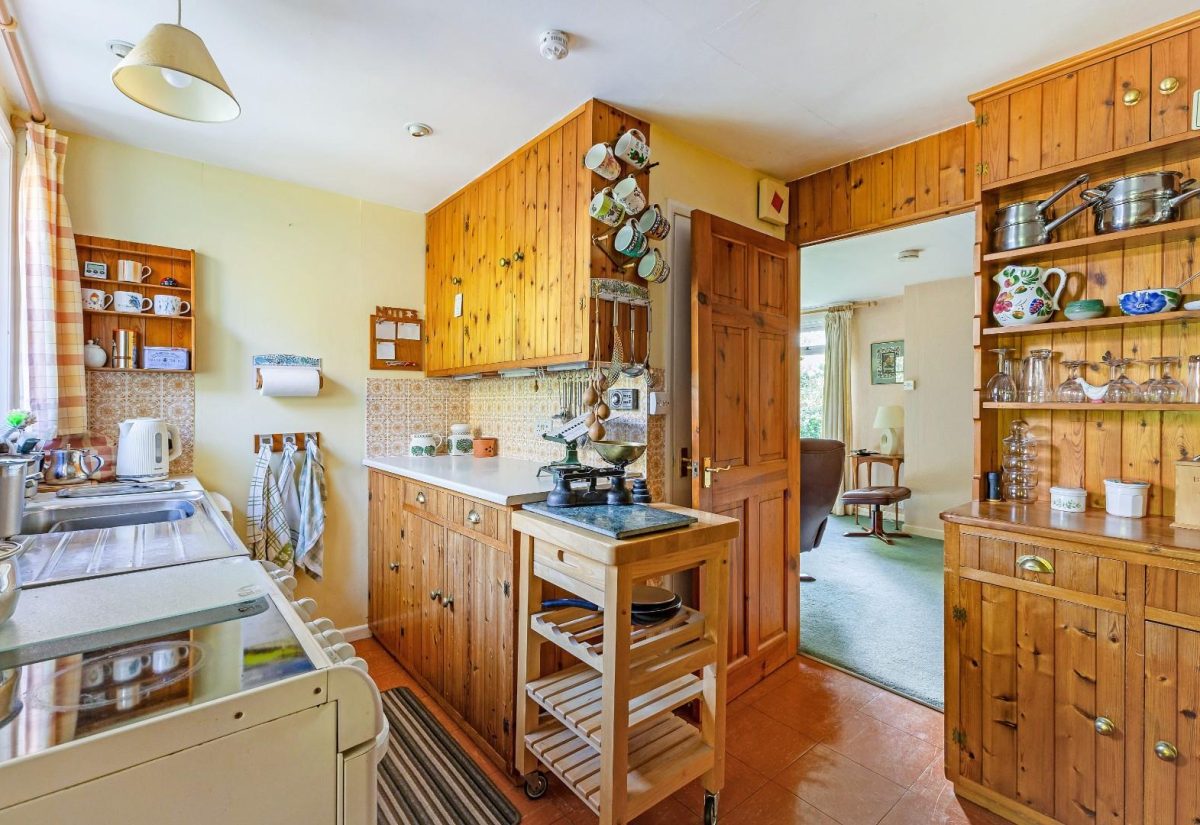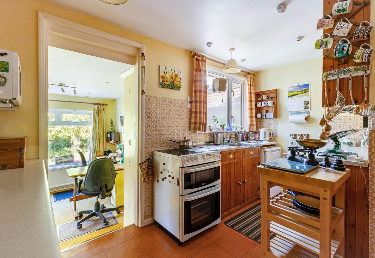 The kitchen, which is fitted with a range of wall and floor-mounted units, complemented by roll-edge work surfaces. From the kitchen, two steps lead down into a rear extension-currently used as a study, though it could equally serve as a breakfast room.
