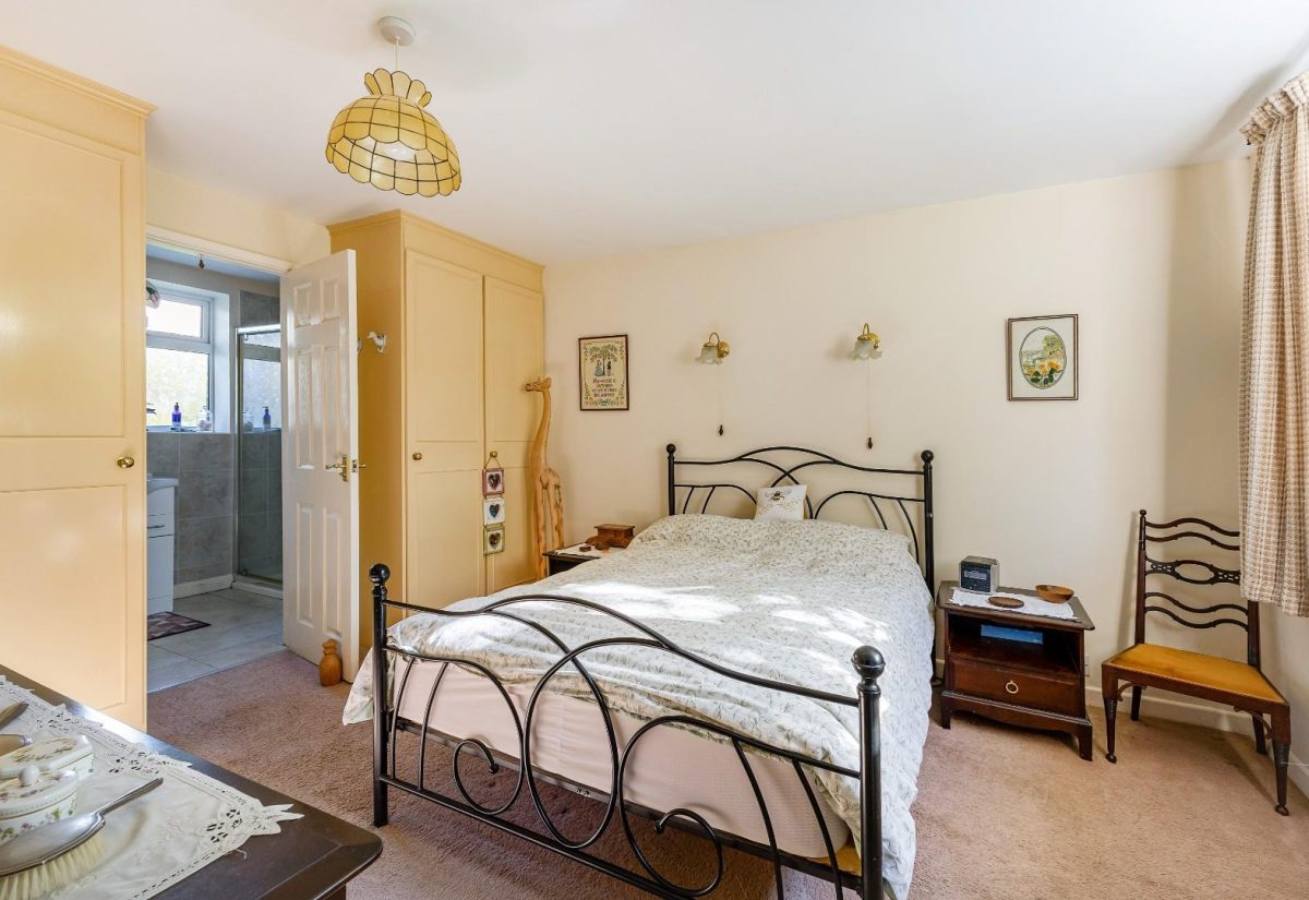 A side extension from the original bungalow, accessed from the lounge, now forms the principal bedroom. This is a well-proportioned double room featuring fitted wardrobes and additional built-in storage cupboards.