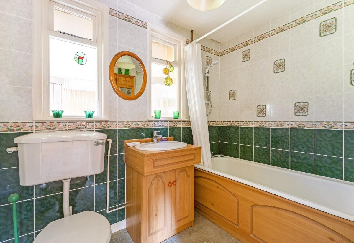 The family bathroom is spacious-possibly once two separate rooms-now combined to form a well-appointed suite. It includes a panelled bath with an over-bath shower, a wash hand basin with vanity storage below, and a WC.