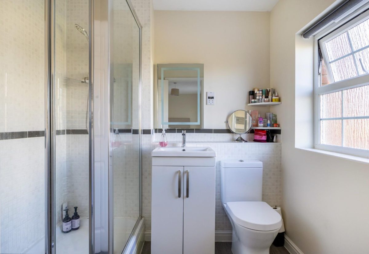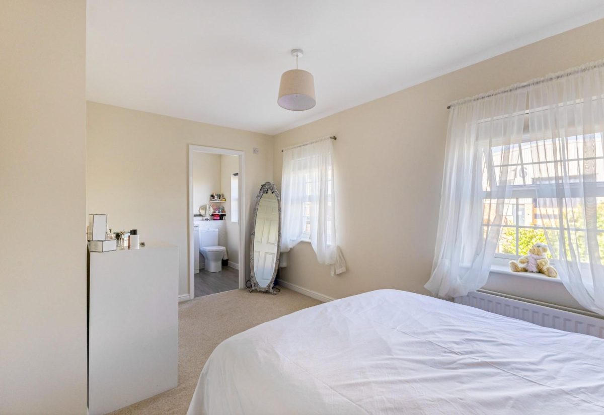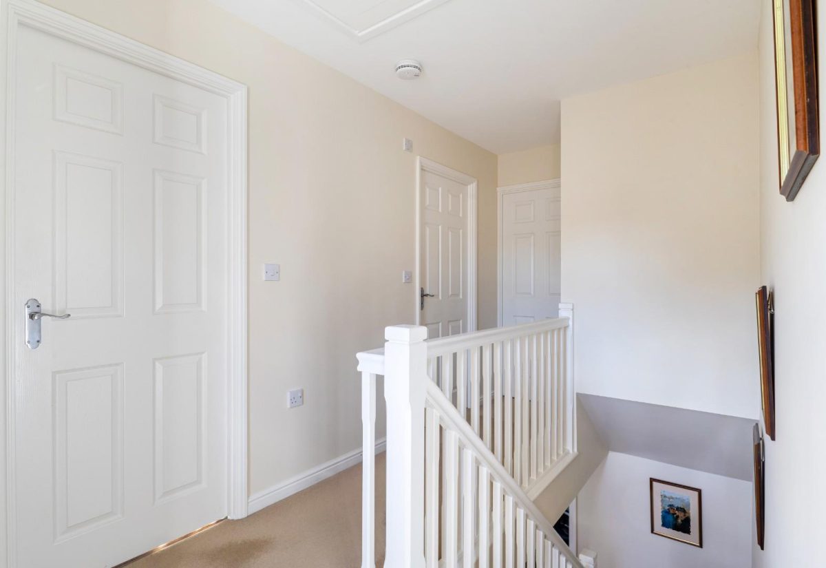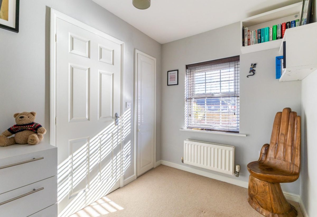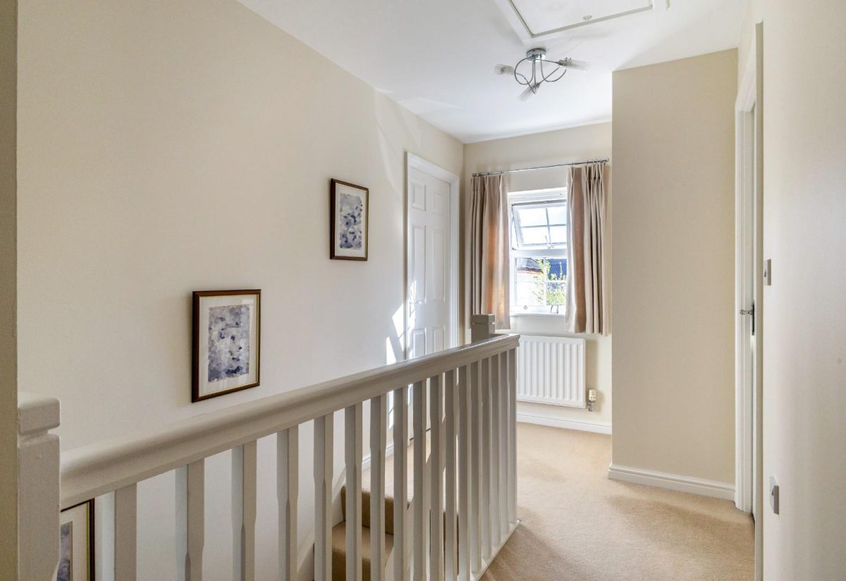 Stairs rise from the sitting room to the first floor, where a spacious landing enhances the sense of openness. There is a small bedroom to the front of the property, complete with a fitted single wardrobe. Adjacent is the family bathroom, fitted with a modern suite including a bath with shower over, wash basin, and WC. On the opposite side of the landing is a well-proportioned double bedroom with fitted wardrobes and front-facing views. The main bedroom is positioned at the rear of the property, featuring two windows overlooking the garden, fitted wardrobes, and a stylish ensuite shower room. The room is particularly bright and tastefully presented.