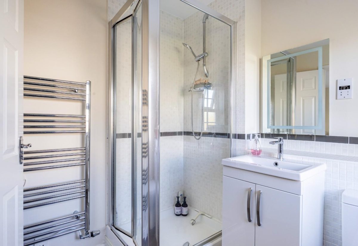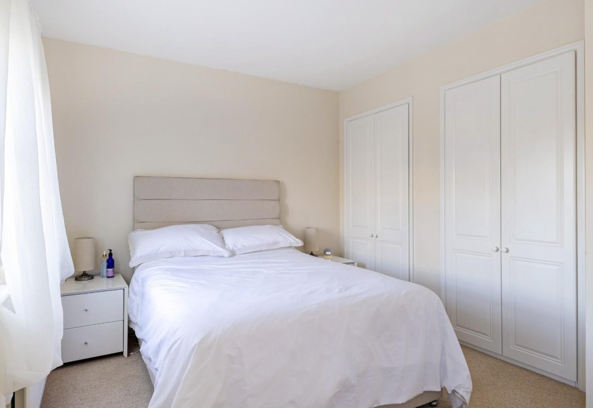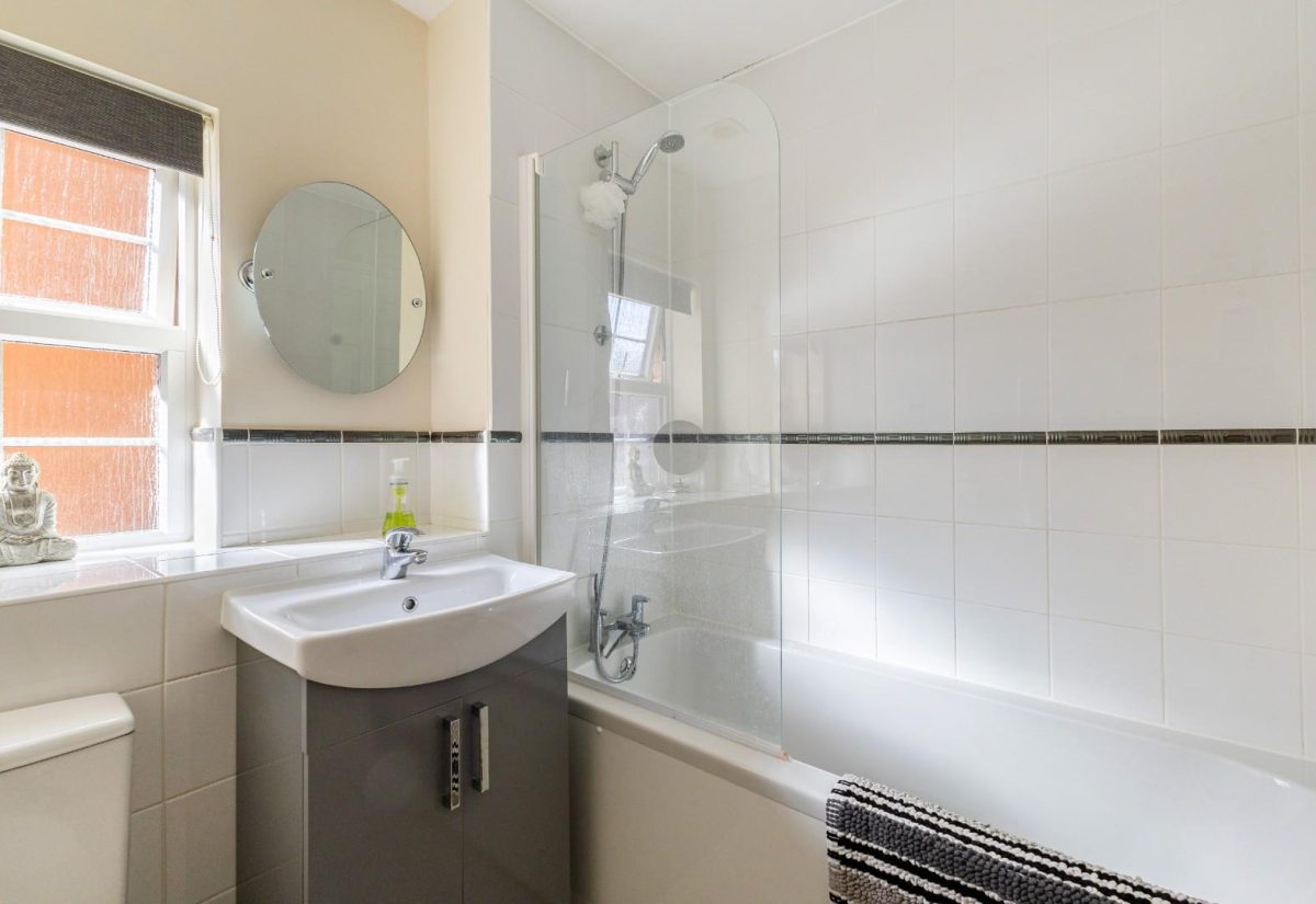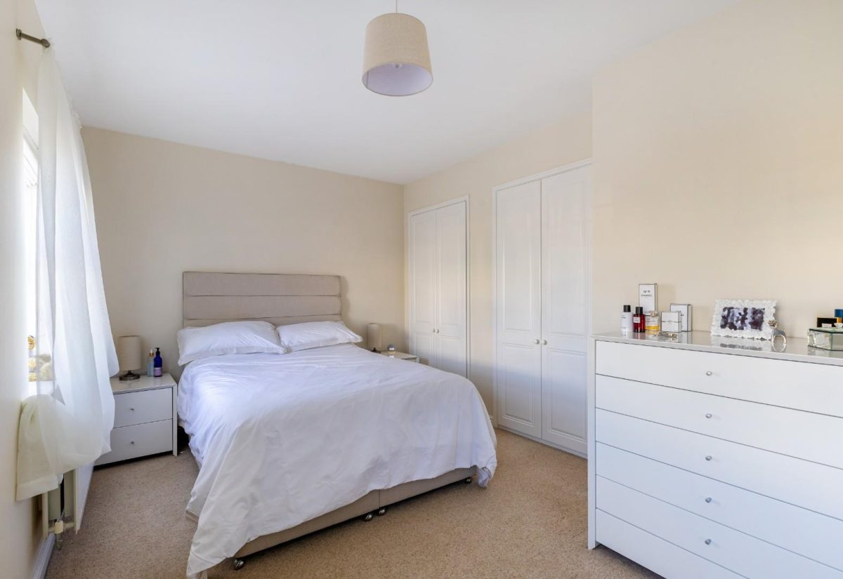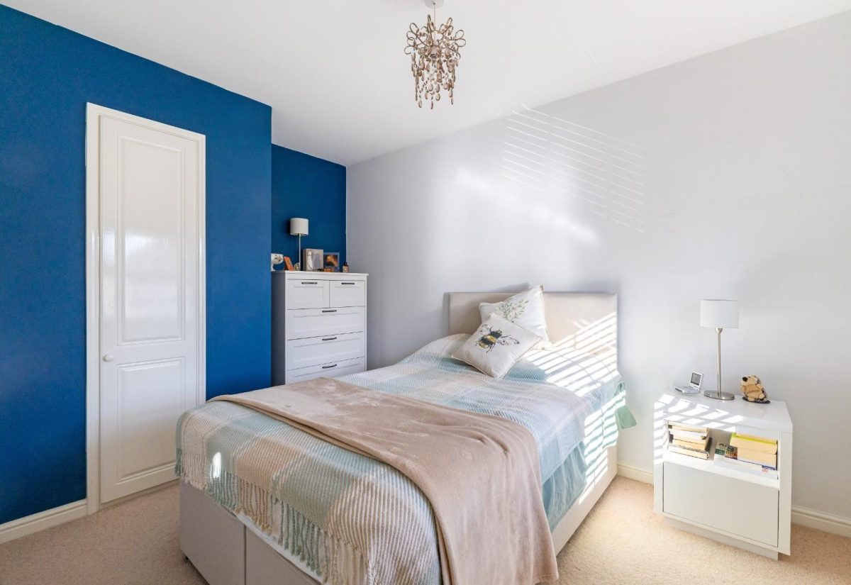 Stairs rise from the sitting room to the first floor, where a spacious landing enhances the sense of openness. There is a small bedroom to the front of the property, complete with a fitted single wardrobe. Adjacent is the family bathroom, fitted with a modern suite including a bath with shower over, wash basin, and WC. On the opposite side of the landing is a well-proportioned double bedroom with fitted wardrobes and front-facing views. The main bedroom is positioned at the rear of the property, featuring two windows overlooking the garden, fitted wardrobes, and a stylish ensuite shower room. The room is particularly bright and tastefully presented.