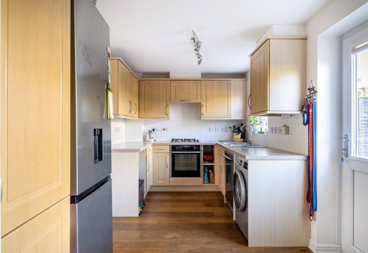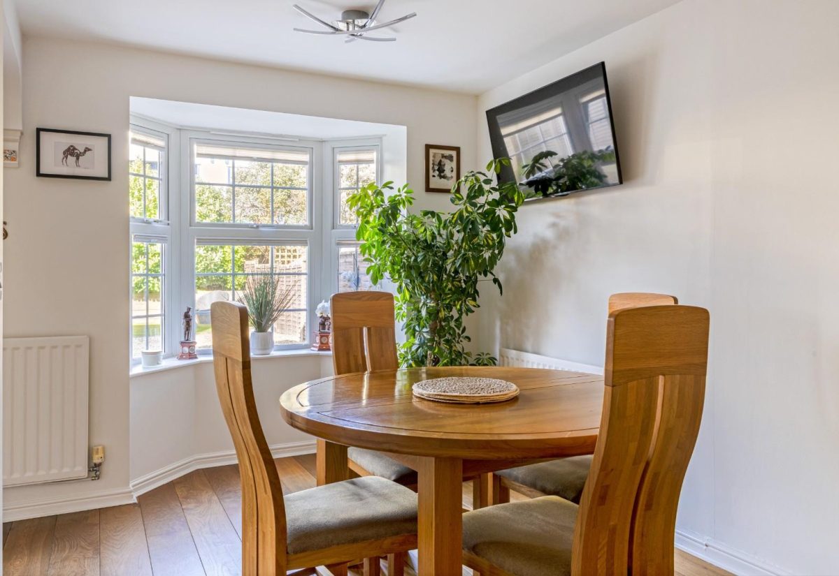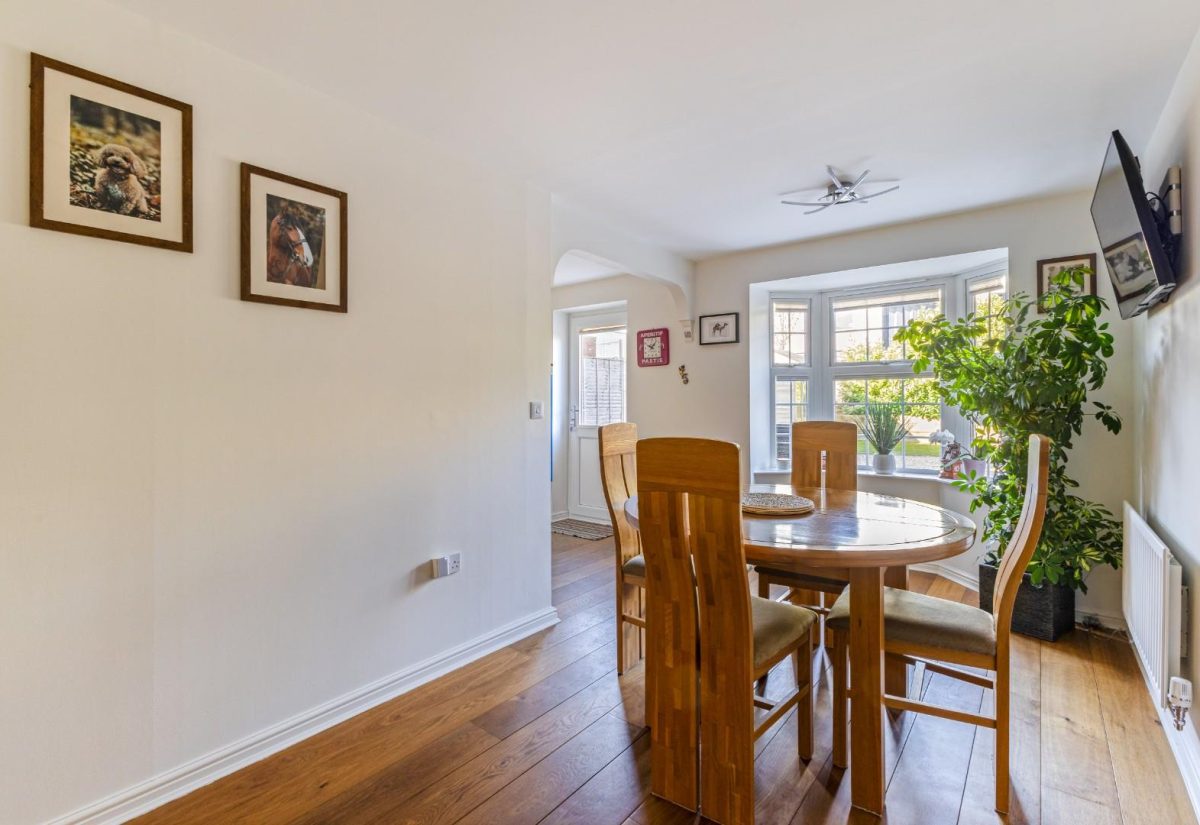 From here, you are led into the extended kitchen, now a superb open-plan family and entertaining space. The kitchen features a range of upper and lower wooden shaker-style units complemented by light worktops. The attractive engineered wooden flooring continues throughout, flowing seamlessly into a dining and snug area. This flexible space easily accommodates both a dining table and a comfortable seating area. A charming bay window overlooks the garden, allowing natural light to flood the room. There is space for a fridge freezer, dishwasher, and washing machine. A rear door provides direct access to the garden.
