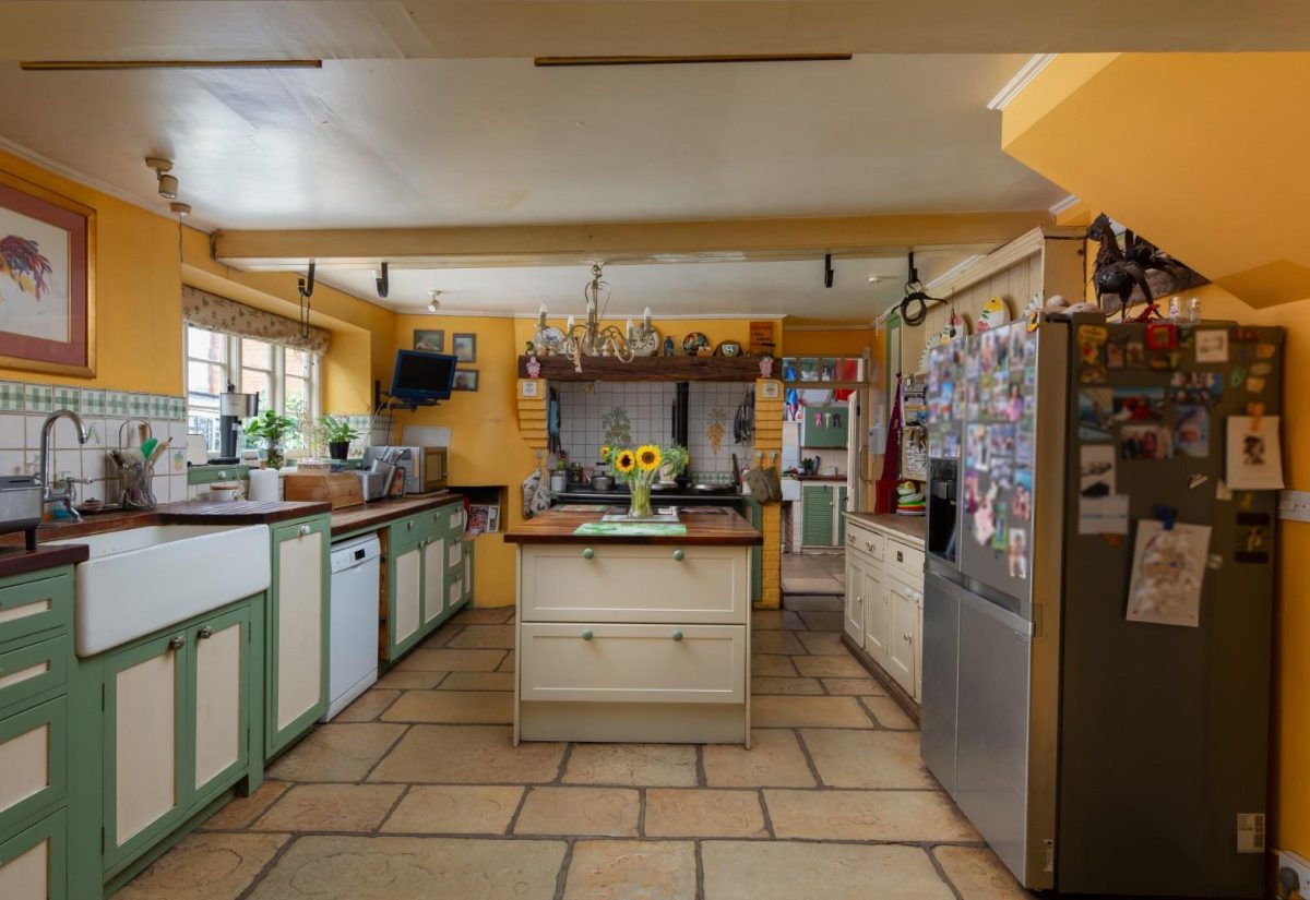 The entrance hall leads into the two main reception rooms, the sitting room and family room, both with open fires and views out over the front garden. The kitchen has a 4-oven Aga and central island, with fitted dresser and space for a dining table to one end. A door leads out to the rear courtyard, with a covered veranda providing access to the pantry, home office and stores. The boot room (with side door to the courtyard), laundry room and downstairs cloakroom are all accessed off the kitchen.