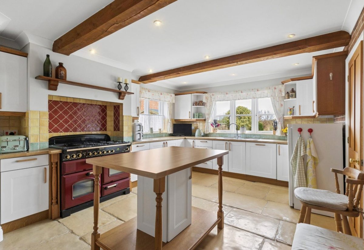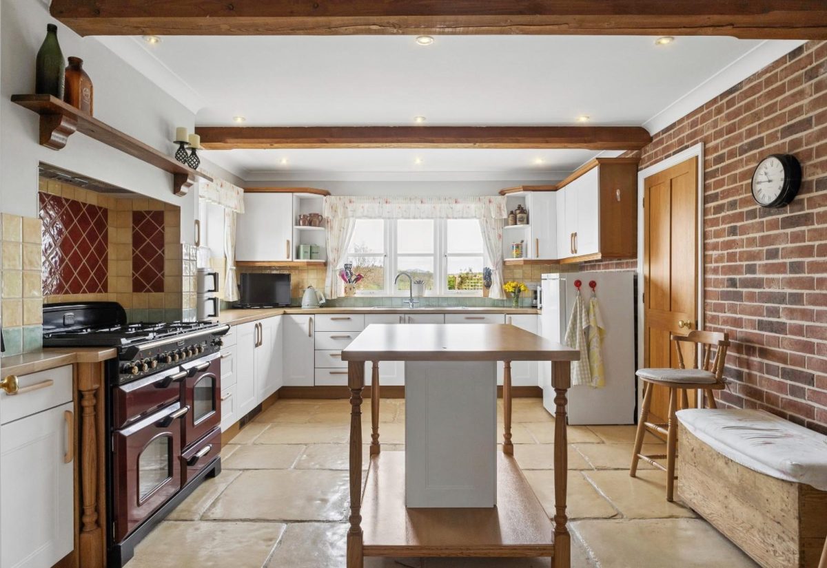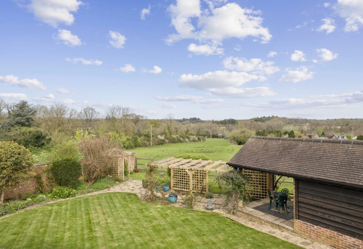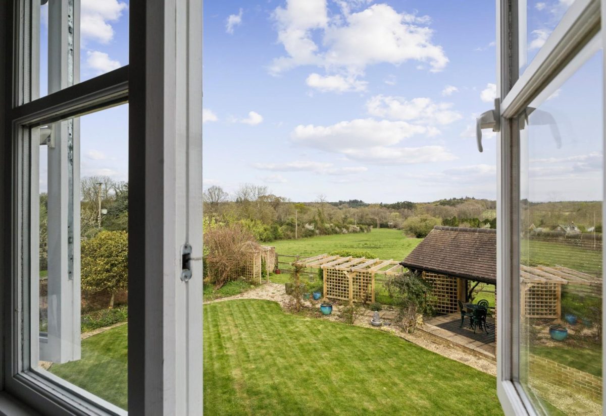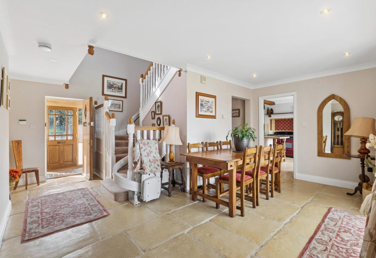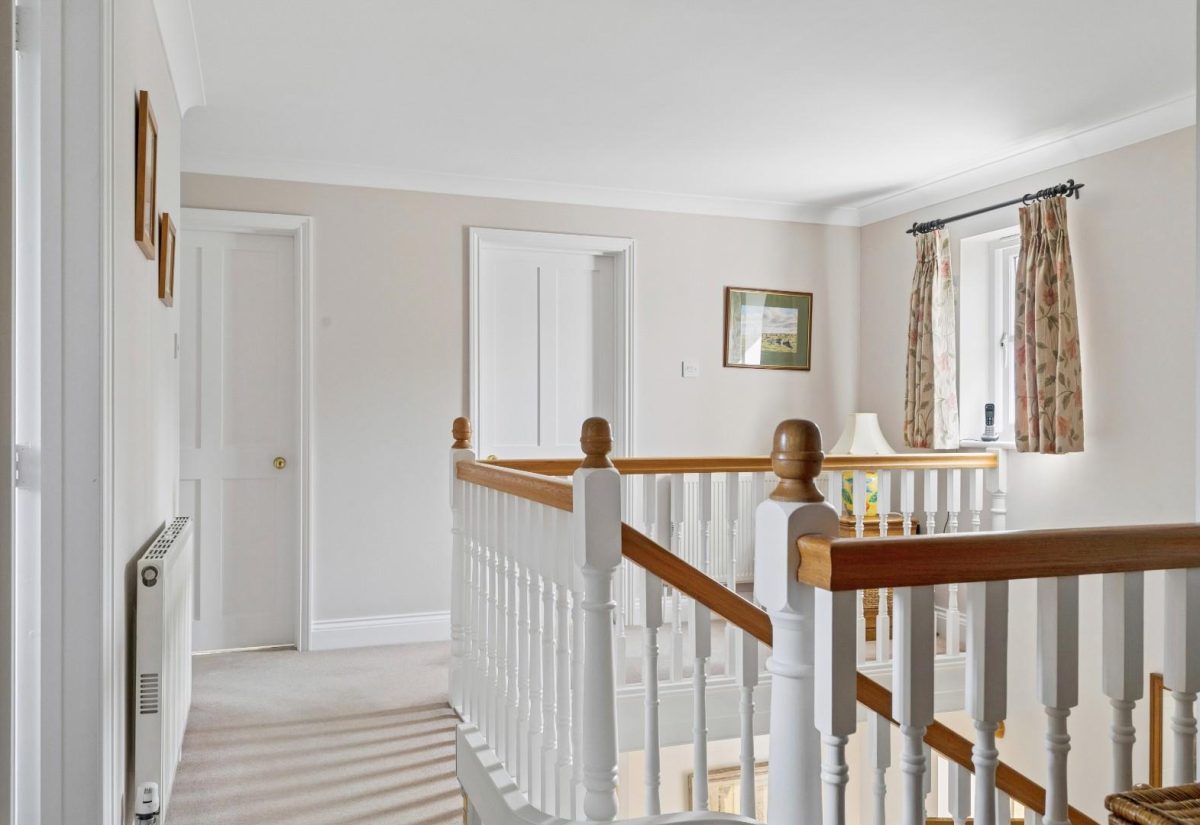 The house offers a welcoming feel, with an oak framed porch leading into a generous dining hall, with polished stone flagged floor and views over the garden. All the ground floor rooms lead off, including a striking dual aspect sitting room with log burner. The family room/study adjoins this ‘enfilade’, with a raised gas fire and garden views. Glass doors lead into the garden room, with venetian blinds offering protection from strong sun. This is a room for year-round use and has superb views and direct access to the garden. There is a useful store under the stairs and a guest cloakroom. The kitchen is fitted with traditional shaker style units and a central island. There is a gas range cooker and a pantry. The utility room has a further WC and is plumbed for a dishwasher and tumble dryer. A side door leads to a covered side passage.