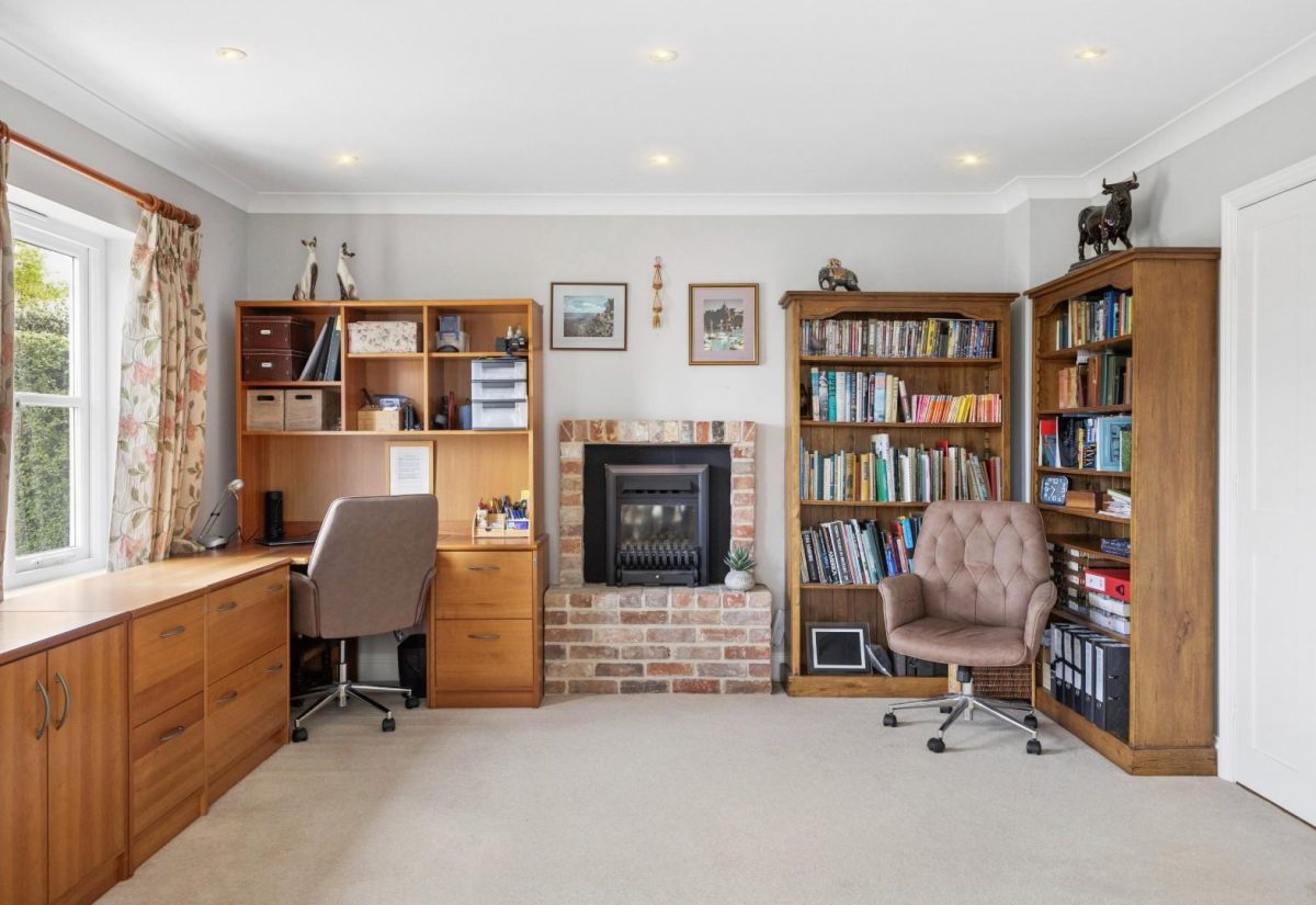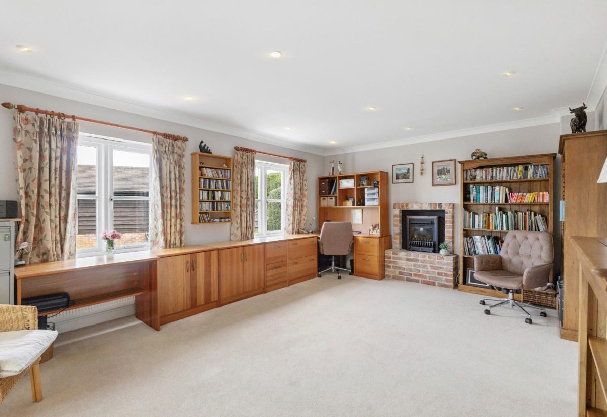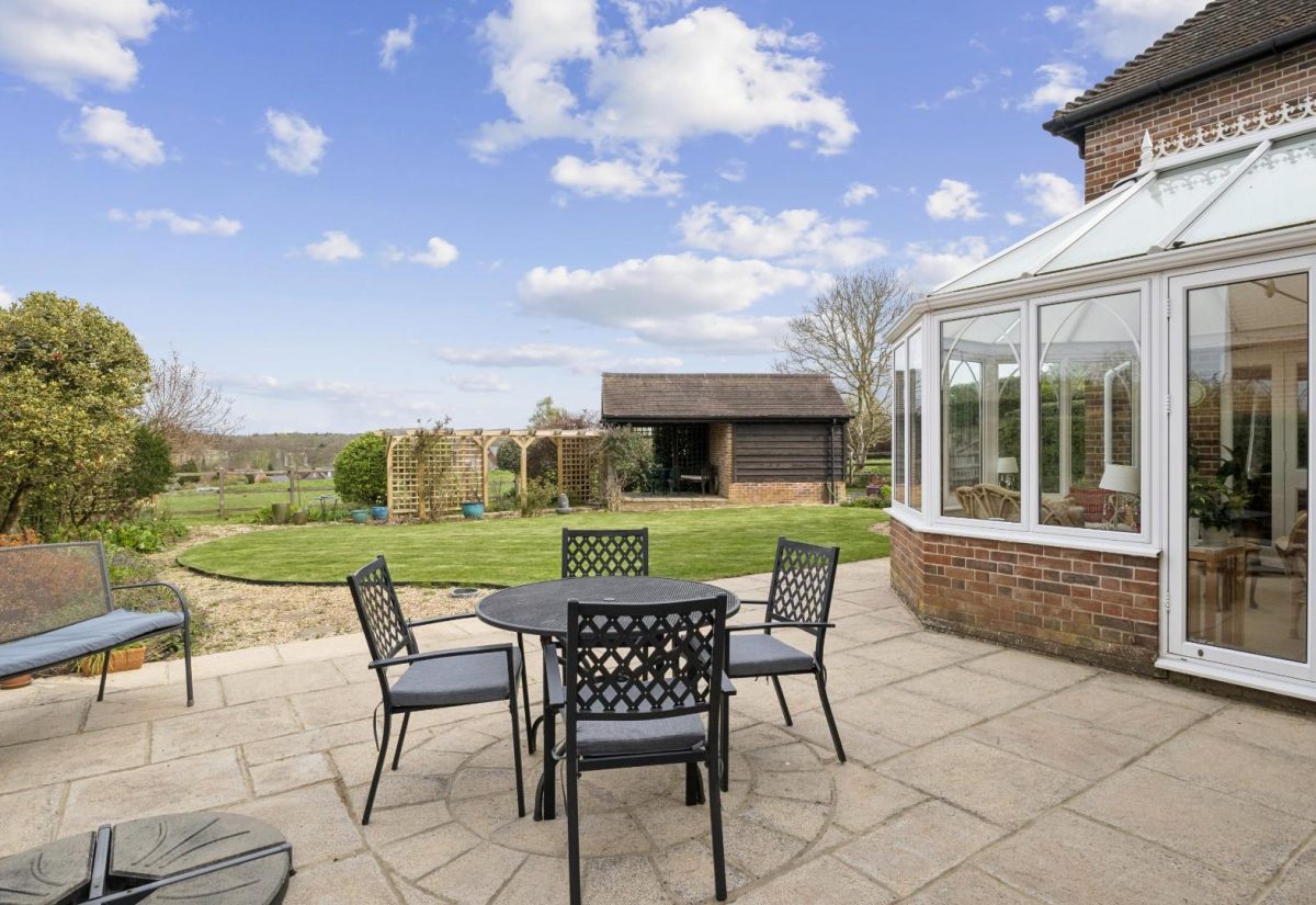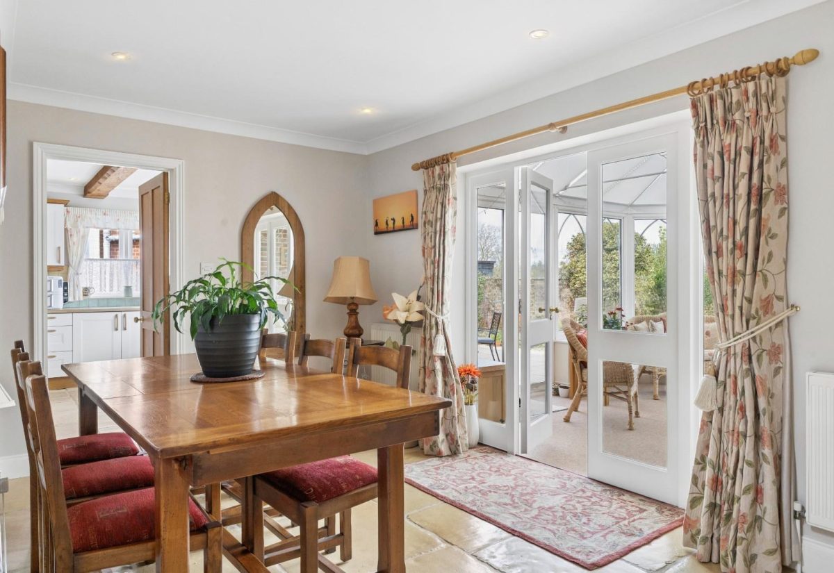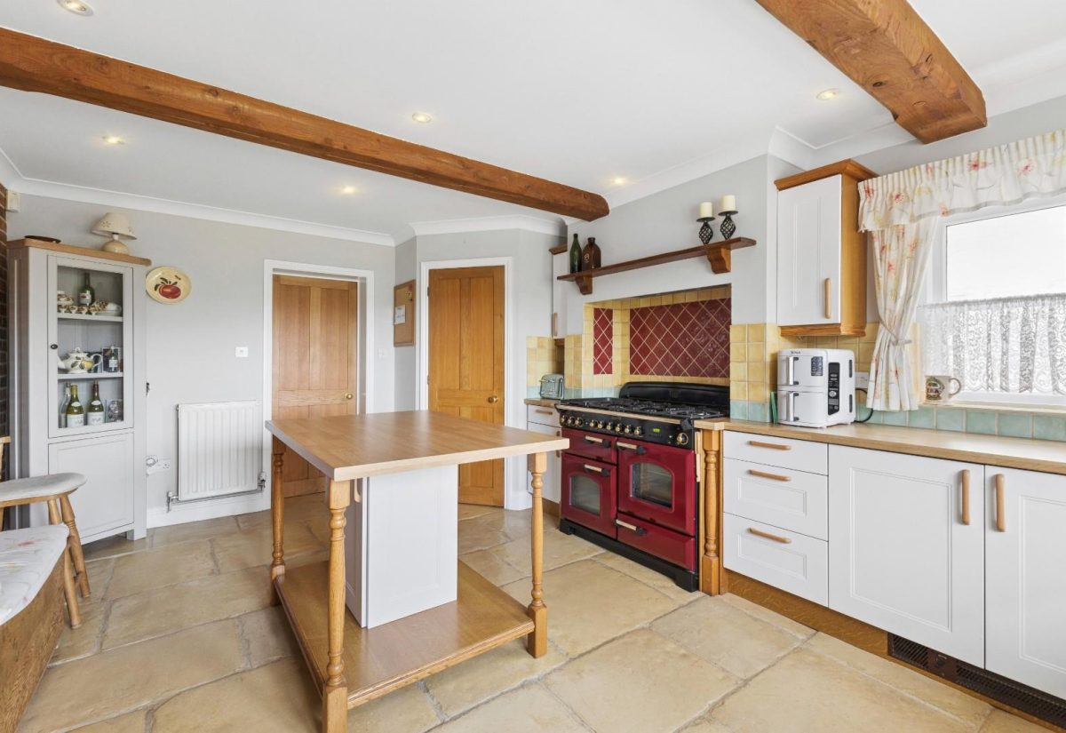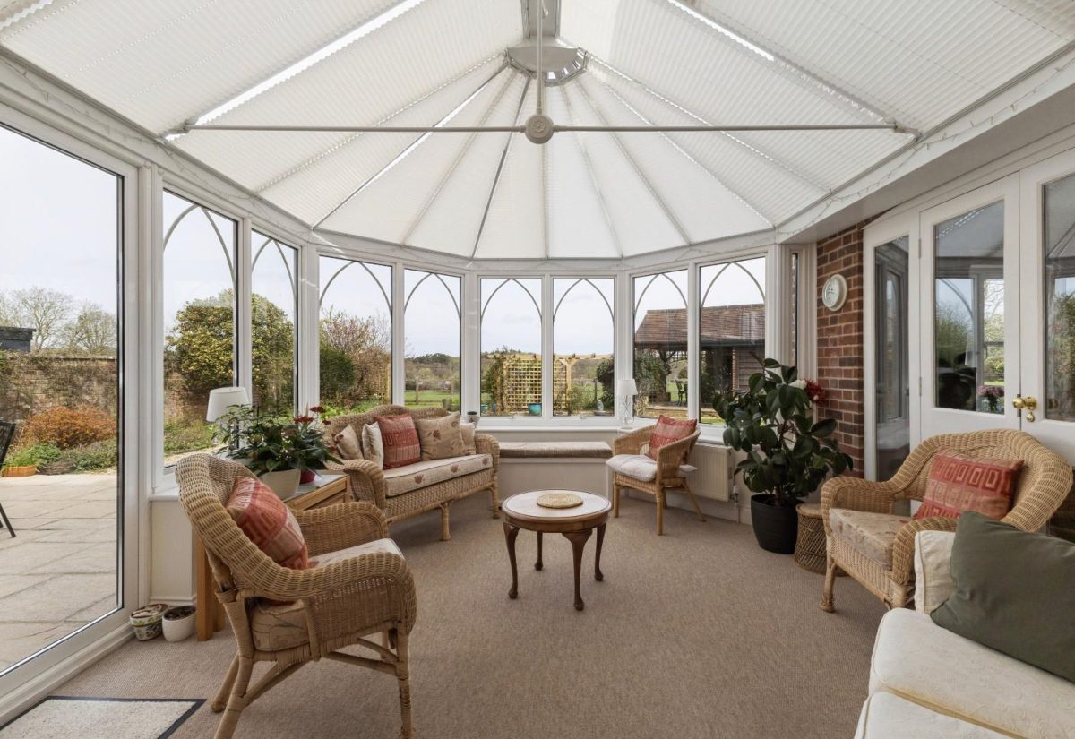 The house offers a welcoming feel, with an oak framed porch leading into a generous dining hall, with polished stone flagged floor and views over the garden. All the ground floor rooms lead off, including a striking dual aspect sitting room with log burner. The family room/study adjoins this ‘enfilade’, with a raised gas fire and garden views. Glass doors lead into the garden room, with venetian blinds offering protection from strong sun. This is a room for year-round use and has superb views and direct access to the garden. There is a useful store under the stairs and a guest cloakroom. The kitchen is fitted with traditional shaker style units and a central island. There is a gas range cooker and a pantry. The utility room has a further WC and is plumbed for a dishwasher and tumble dryer. A side door leads to a covered side passage.