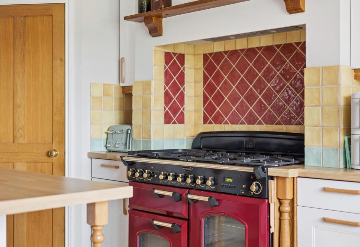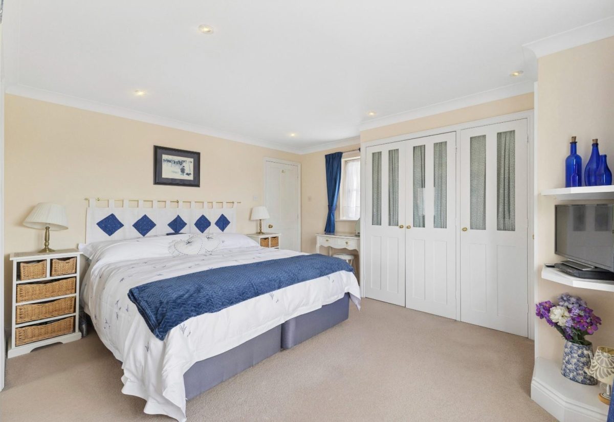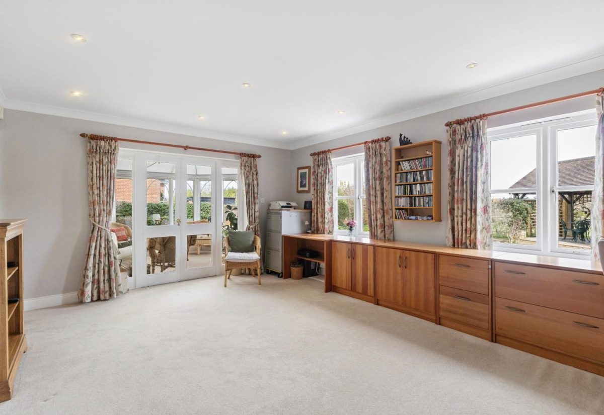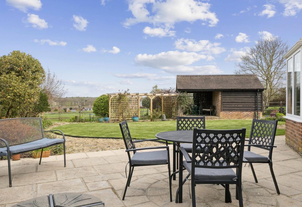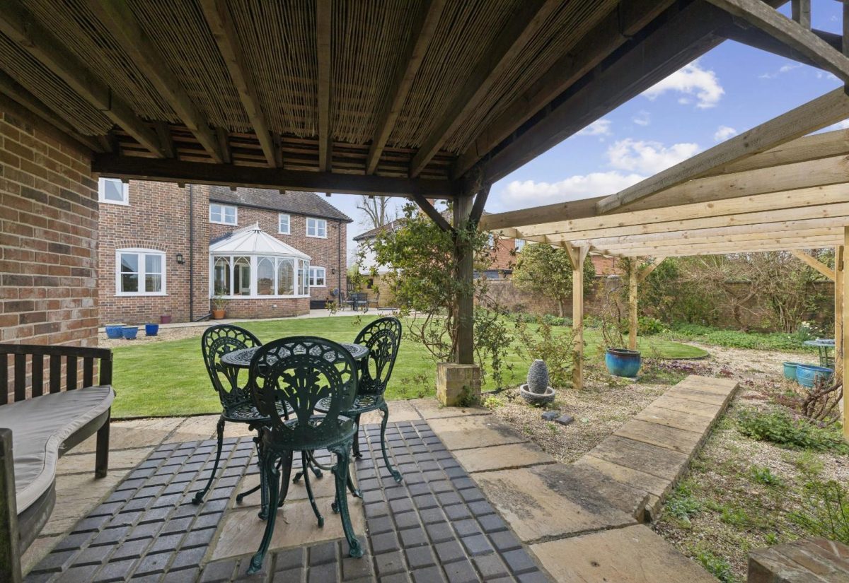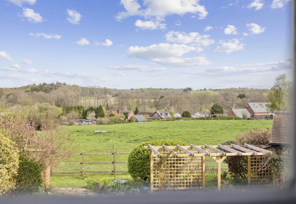 The house offers a welcoming feel, with an oak framed porch leading into a generous dining hall, with polished stone flagged floor and views over the garden. All the ground floor rooms lead off, including a striking dual aspect sitting room with log burner. The family room/study adjoins this ‘enfilade’, with a raised gas fire and garden views. Glass doors lead into the garden room, with venetian blinds offering protection from strong sun. This is a room for year-round use and has superb views and direct access to the garden. There is a useful store under the stairs and a guest cloakroom. The kitchen is fitted with traditional shaker style units and a central island. There is a gas range cooker and a pantry. The utility room has a further WC and is plumbed for a dishwasher and tumble dryer. A side door leads to a covered side passage.