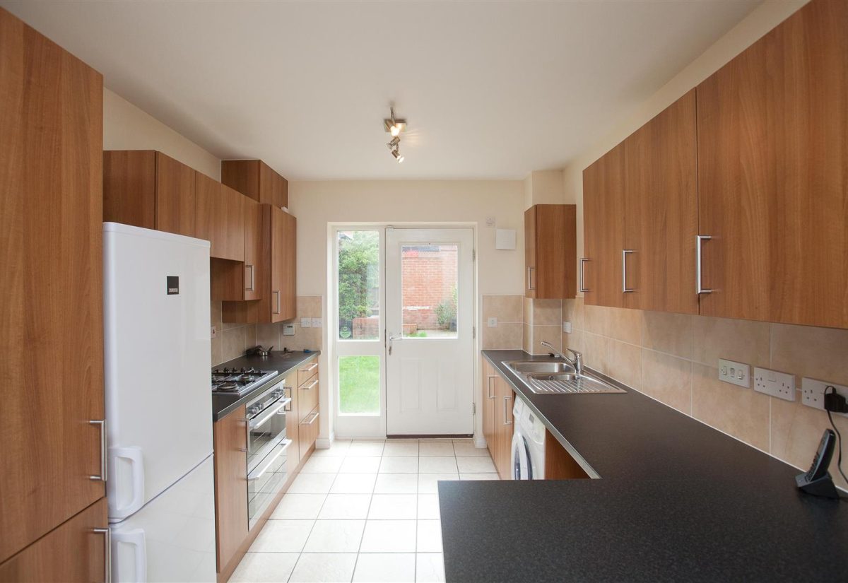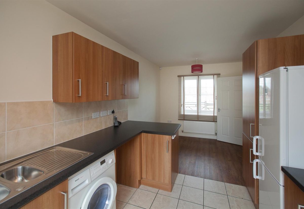 Upon entering, you are welcomed into a hallway with stairs leading to the first floor and access to a convenient downstairs cloakroom and storage cupboard. From the hallway, you move into a bright and practical kitchen/breakfast room, featuring a range of wooden wall and base units with black worktops. There is space for a fridge freezer and washing machine, as well as room for a dining table, making it an ideal space for everyday family living and entertaining. A door from the kitchen leads out to the low-maintenance rear garden.
