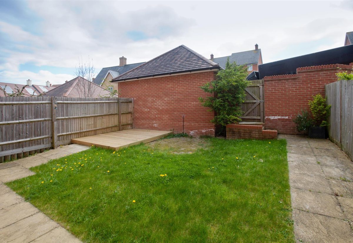 The rear garden is designed for low maintenance, featuring both decking and patio areas, perfect for enjoying the sunshine. A pathway leads from the house to the back gate, providing access to the garage and allocated parking space.
