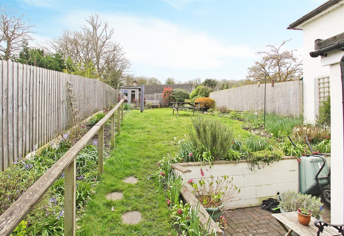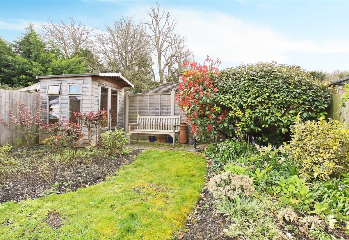 The south facing garden has been well stocked with plants and shrubs around a flat lawned area. There are different areas to sit and enjoy the sun at different times of the day, with a patio by the kitchen window and an area around the summer house at the top of the garden. Parking is readily available immediately outside the property, with space for two within the width of the plot. The driveway could likely fit a small car, but offers space for a possible extension and/or garden access. At the end of the drive is a useful garden shed.